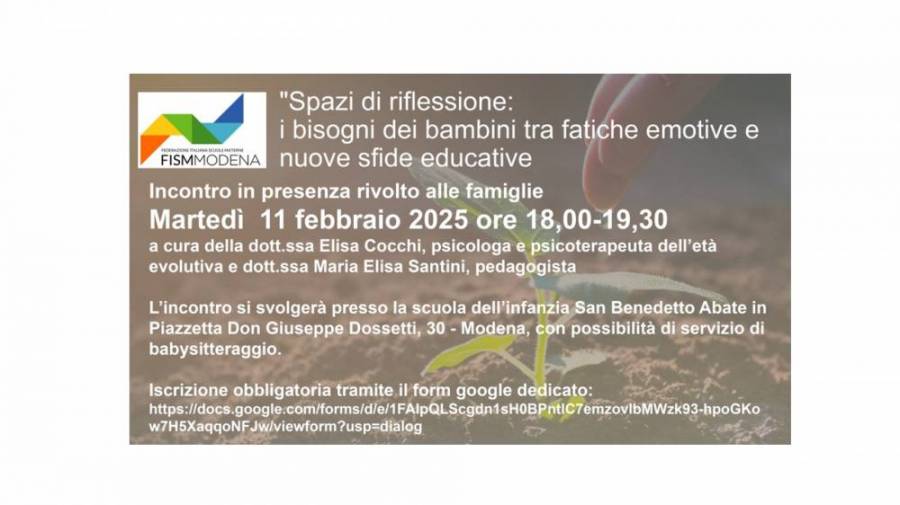 L’incontro si terrà Martedì 11 febbraio 2025 dalle ore 18:00 alle ore 19:30 presso la scuola dell’infanzia San Benedetto Abate in Piazzetta Don Giuseppe Dossetti, 30 - Modena, con possibilità di servizio di babysitteraggio.